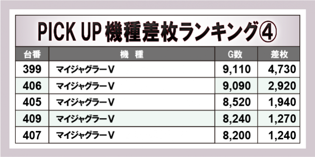 上表の5機種は打ちごたえのある状況が整っていた様子から、館内の盛り上がりに大きく貢献していたと言える。この日のトップ差枚数を記録した『押忍!番長4』のほか、至る箇所で綺麗な右肩上がりのグラフを描いており、『ジャグラー』シリーズも負けていなかった。『マイジャグラーⅤ』『ゴーゴージャグラー3』では高い回転数で多くの4桁プラス台が存在し、遊技するファンが競い合うかのようにレバーを叩いていたのが印象的だ。