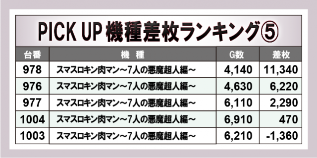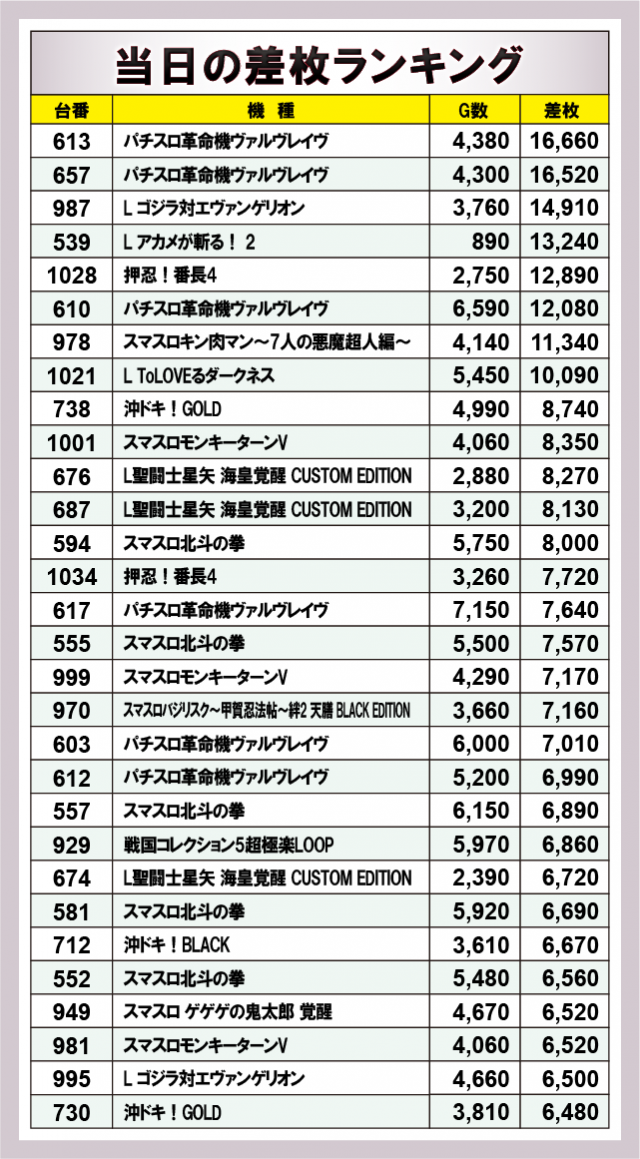 上表の通り、『パチスロ革命機ヴァルヴレイヴ』『L ゴジラ対エヴァンゲリオン』『L アカメが斬る! 2』『押忍!番長4』『スマスロキン肉マン~7人の悪魔超人編~』『L ToLOVEるダークネス』から万枚OVERが発生!さらにピックアップ30台全てが+6千枚OVERという結果は圧巻で、館内は凄まじい熱気に包まれていたことが分かる。