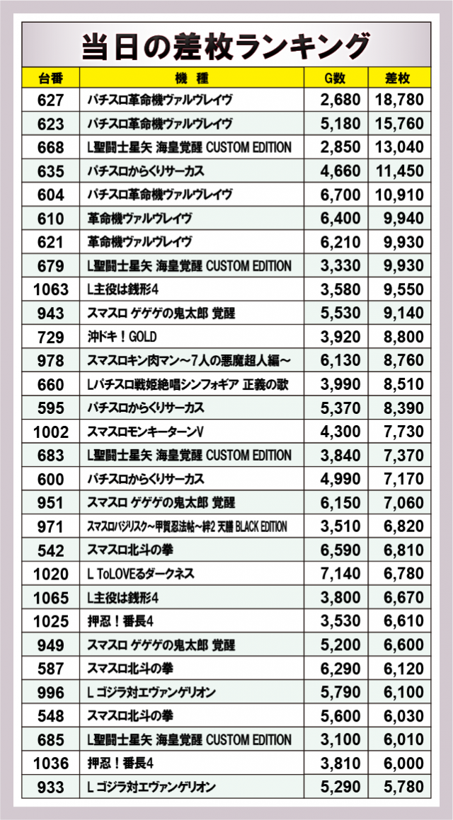『パチスロ革命機ヴァルヴレイヴ』『L聖闘士星矢 海皇覚醒 CUSTOM EDITION』『パチスロからくりサーカス』から万枚OVERが発生し、店内の盛り上がりをリードする存在となっていた。またこれだけにとどまらず、『L主役は銭形4』や『スマスロ ゲゲゲの鬼太郎 覚醒』など数多くの機種から大台突破台が生まれている。凄まじい熱気を肌で感じ、同店の高い実力に酔いしれたことだろう。