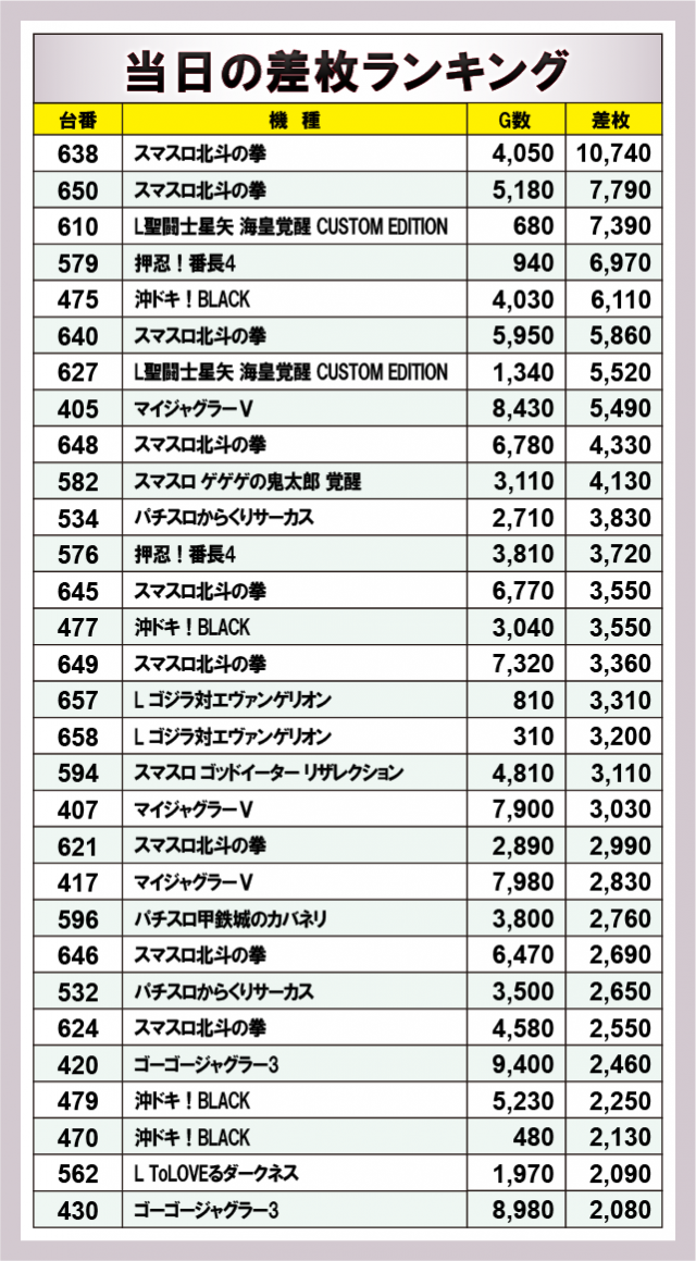 『スマスロ北斗の拳』から万枚OVERが飛び出しており、ほかにも『L聖闘士星矢 海皇覚醒 CUSTOM EDITION』『押忍!番長4』『沖ドキ!BLACK』から6~7,000枚OVERが発生。大台突破台が多く存在し、ファンはまとまった出玉を獲得し、恍惚の表情を覗かせていたのも見逃せないポイントだ。