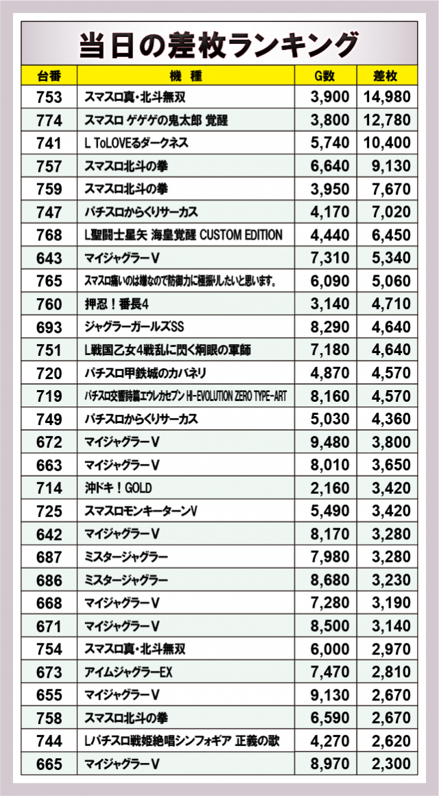 上表に取り上げた5機種は、いずれも店内を包み込む熱気を形成した機種と言える。スマスロを中心に万枚OVERや大台突破台が多数生まれているわけだが、『マイジャグラーⅤ』『ミスタージャグラー』といった『ジャグラー』シリーズも負けず劣らず、+5,000枚OVER台を筆頭に好成績をマークし、相当な手応えを感じていたのは間違いないだろう。