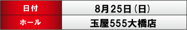 8月25日、玉屋×DMMぱちタウンのコラボ企画「たまピー来店取材」が『玉屋555大橋店』にて実施された。前回では万枚OVERが2台発生するなど、盛況ぶりを披露した同店。この日も気合を入れて臨んだ一戦となったが、果たしてホール内の盛り上がりはどうだったのか…さっそく以下からその詳細をご覧いただきたい!