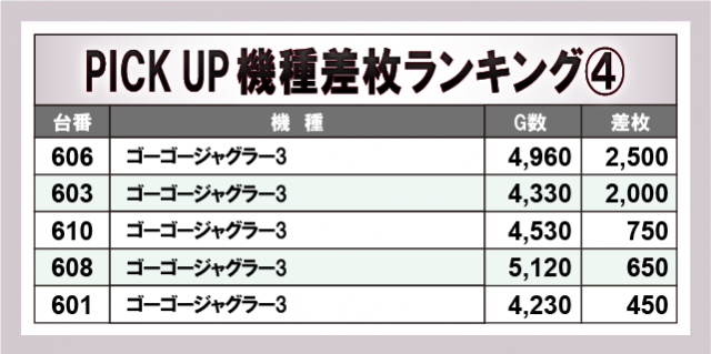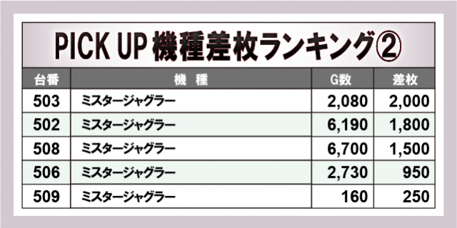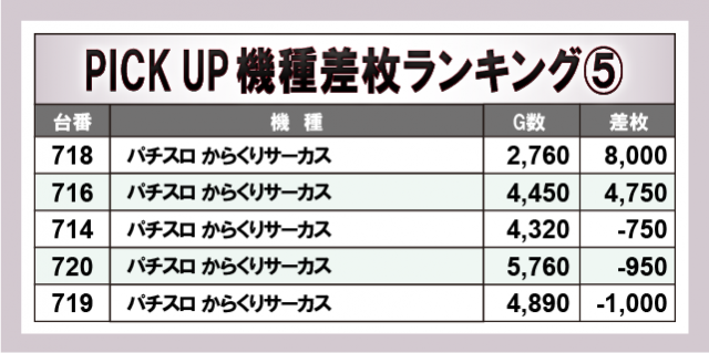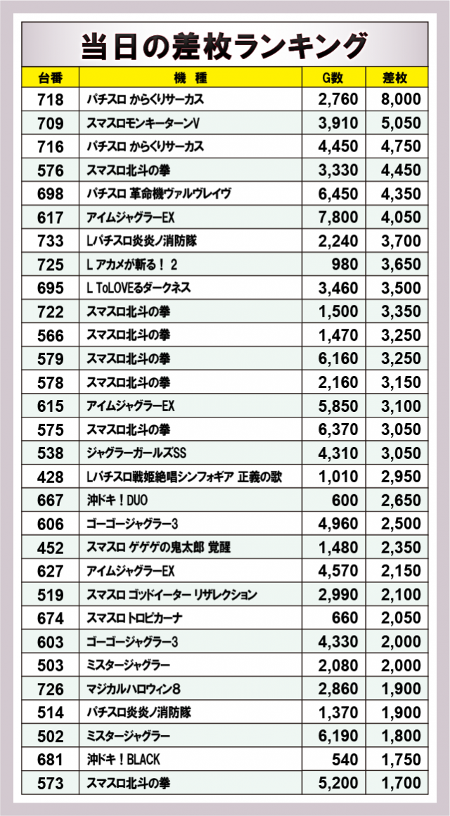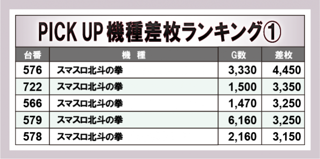 当日とくに店内を盛り上げた機種は上表の5機種。なかでも、目立っていたのは上述でも触れたように『スマスロ北斗の拳』で、+3千枚OVERを多数マークし、コンスタントな大当りを披露していたのが印象的だ。いずれの機種も高いパフォーマンスを披露し、ファンは有意義な時間を過ごせたことだろう。