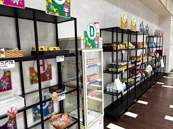 景品コーナーにはお菓子やドリンクなど多彩なアイテムが並んでおり、プレイヤーたちの興味を引いていた。