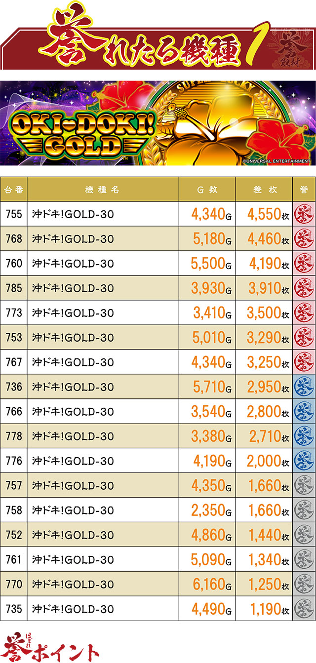 さすがは沖スロの聖地・沖縄。『沖ドキ!GOLD-30』が元気じゃないと始まらない。36台設置の同機からプラス台が量産され、嬉しい悲鳴と大当り音が入り混じるシマと化していた!