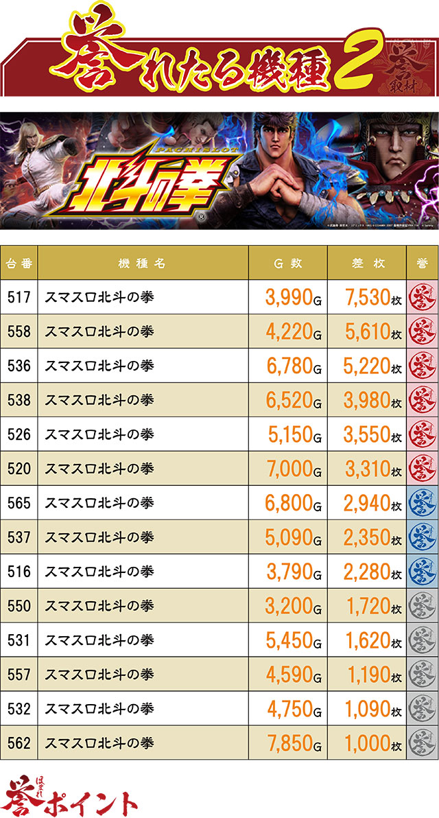 設置の半数近い台数が誉マークとなった『スマスロ北斗の拳』。+3,000枚超え記録が6台も生まれるなど、環境は非常に良好だったようだ。特に7,500枚超えを果たした517番台は手応え十分…!?