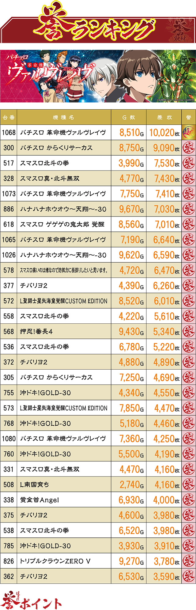 やはり、沖縄の地でも『パチスロ 革命機ヴァルヴレイヴ』は強かった!10,000枚を超える文句なしの記録で、この日の首位レコードに。さらにTOP30の記録はすべて+3,000枚オーバーというとんでもない結果!