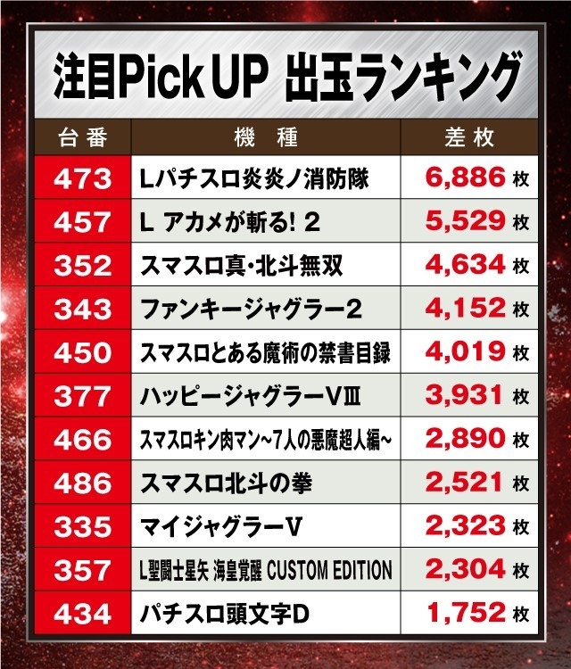 この日は、スマスロとジャグラーシリーズが好調でランキングの上位を占めた。なかでもスマスロの『Lパチスロ炎炎ノ消防隊』で+6,886枚、『L アカメが斬る! 2』で+5,529枚と+5,000枚超を叩き出し店内を盛り上げていた。