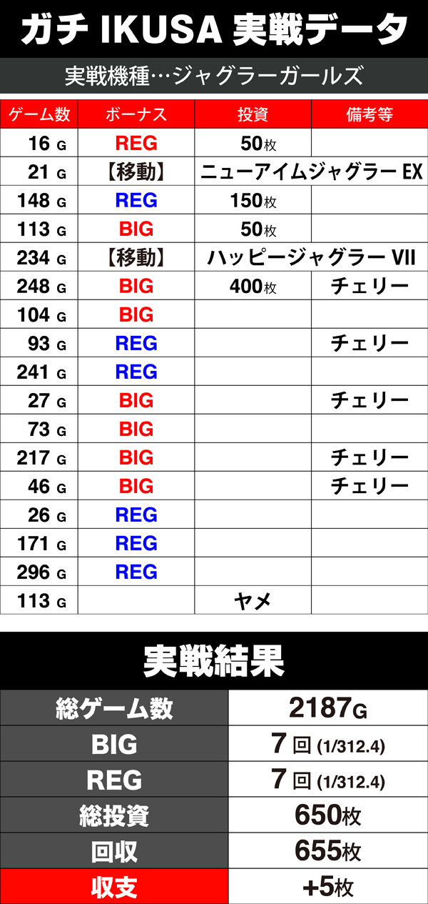 結果的には、この日に打ったすべての台でボーナスを獲得し、プラス5枚の差枚で戦いを終えた。