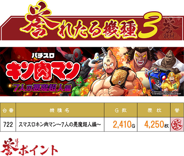 『スマスロキン肉マン~7人の悪魔超人編~』からも赤誉マーキングが飛び出した。722番台は順当に大当りを引き当て続け、最終的にはこの日のトータルランキング4位に食い込むほどの活躍!