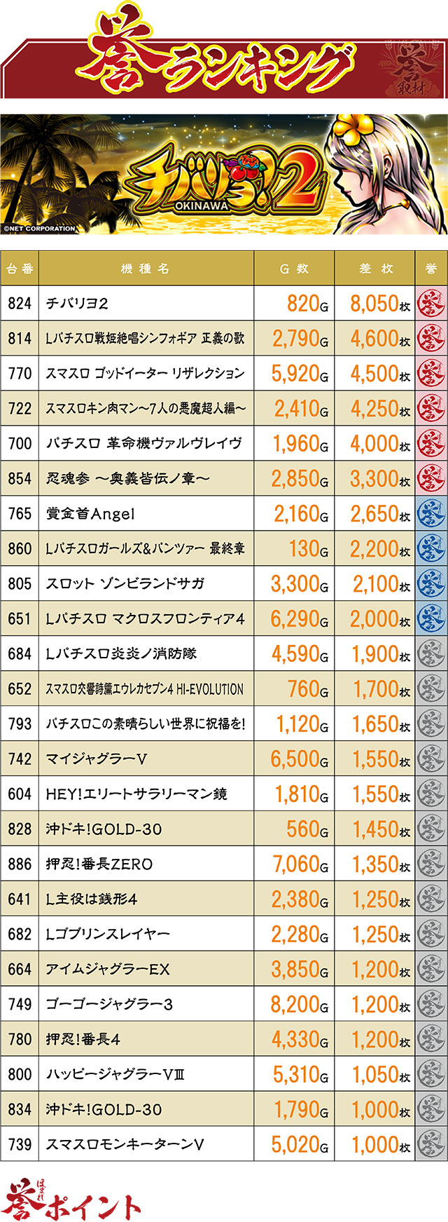 3台設置の『チバリヨ2』だが、プラス差枚となったのは、この日の首位記録となった824番台のみ。それだけに圧倒的な実力差を見せつける結果となったようだ。