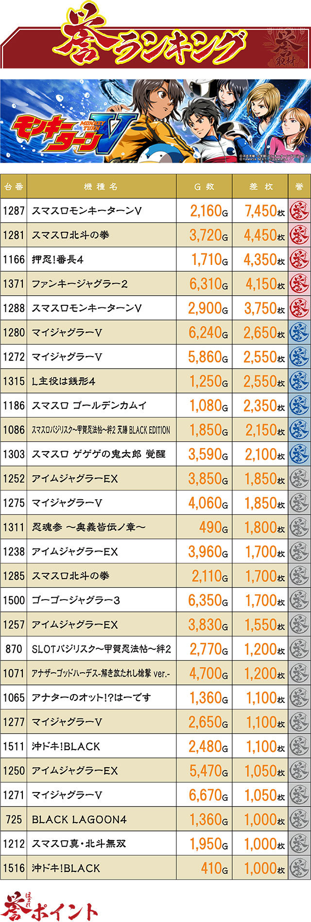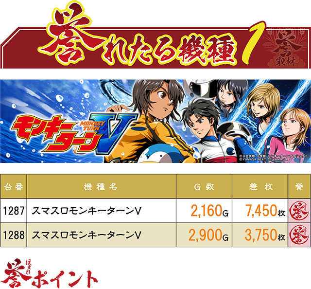 『スマスロモンキーターンV』がこの日のTOPレコードに輝いた8月18日の誉取材。『スマスロ北斗の拳』や『押忍!番長4』、さらには『ファンキージャグラー2』からも4,000枚を超える結果が飛び出すなど、見どころの多い1日だった。惜しむらくは、赤誉マークの数が控えめだったこと…。