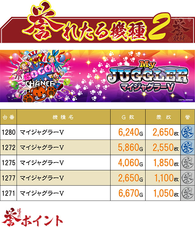 半数以上の台がプラっていた『マイジャグラーⅤ』の中で、特に光る活躍を見せたのがこの5台。3,000枚を超えることはなかったが、その挙動は素人目にも良好に映っていたようだ。
