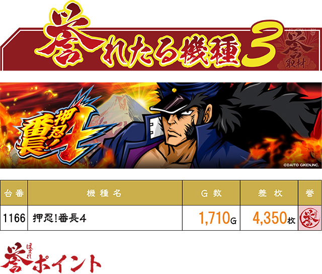 全体的に稼働がおとなしめだった『押忍!番長4』の中で、唯一気炎を吐いていたのが1166番台。多くの見せ場を作り、同機種がハズレ機種でないことを自ら証明してみせた。