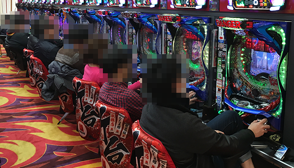 4円パチンコでは朝イチに引き続き、「CRぱちんこ GANTZ」と「CR戦国乙女〜花〜」が満席。機種の魅力を堪能できているようなプレイヤーのイキイキとした表情も印象的であった。
