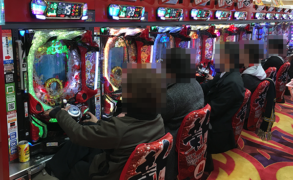 14時をまわった頃の4円パチンコにおいて、もっとも盛り上がっていたのは「CR戦国乙女〜花〜」。機種の性能を最大限まで引き出しているようなプレイヤーが目立ち、注目を集めていた。