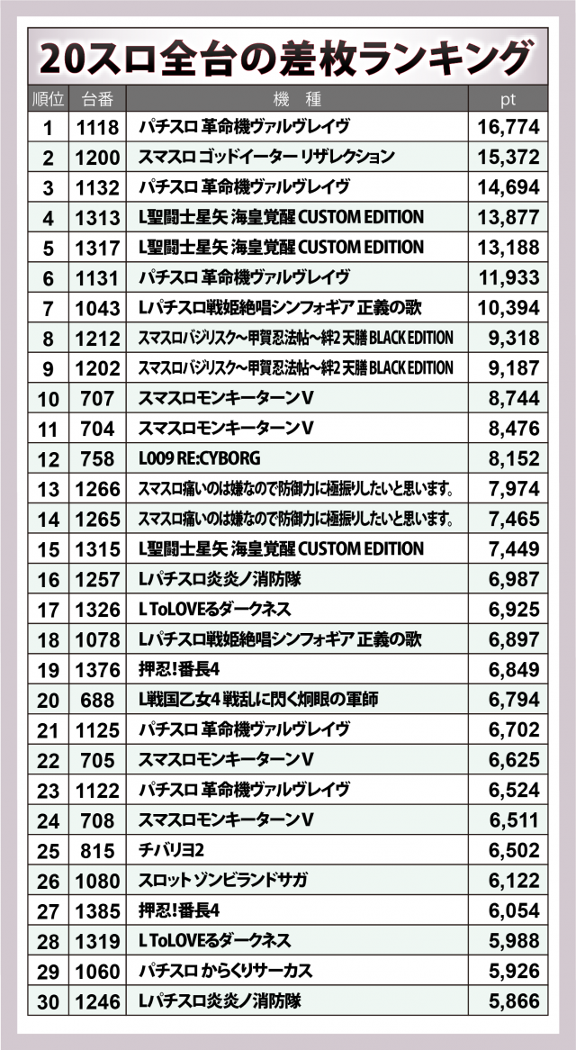 またもや万枚オーバーが相次ぎ、『パチスロ 革命機ヴァルヴレイヴ』では+1万7千弱・+1万5千弱・+1万2千弱と3台がプラス5桁を達成した上に、『スマスロ ゴッドイーター リザレクション』『L聖闘士星矢 海皇覚醒 CUSTOM EDITION』『Lパチスロ戦姫絶唱シンフォギア 正義の歌』 と、7機種が大量獲得をマーク。
