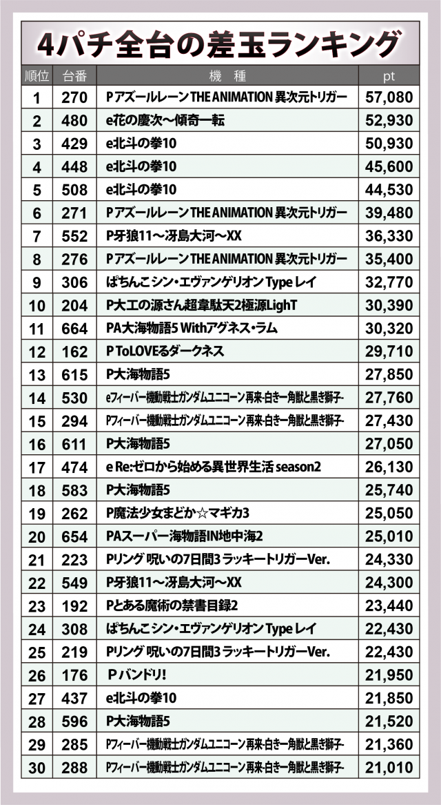 お次は4パチをクローズアップ、トップ30台をまとめた。