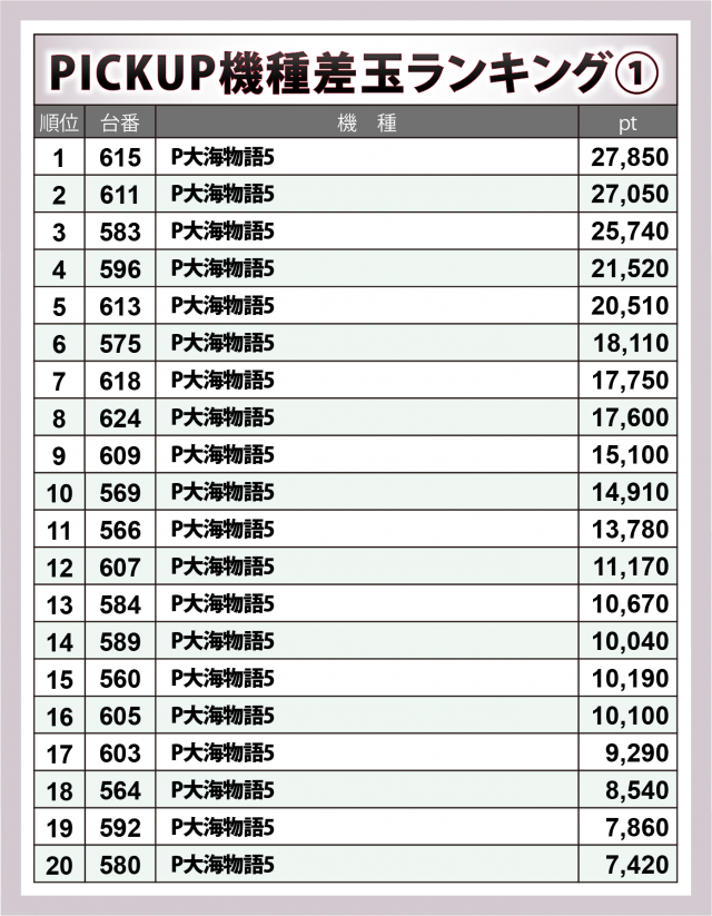最後は4パチ最多設置となる78台の『P大海物語5』にズームイン。今回はベスト20台をピックアップする。