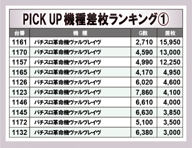『パチスロ革命機ヴァルヴレイヴ』では、3台の万枚OVER台を筆頭に複数台で右肩上がりに伸びるグラフを形成しており、遊技していたファンは間違いなく手応えを感じていたはずだ。また、『マイジャグラーⅤ』でも多くの台がプラス差枚数を記録。+2~3,000枚OVERも見られ、回転数と差枚数が比例する展開を披露していたのが鮮烈だ。