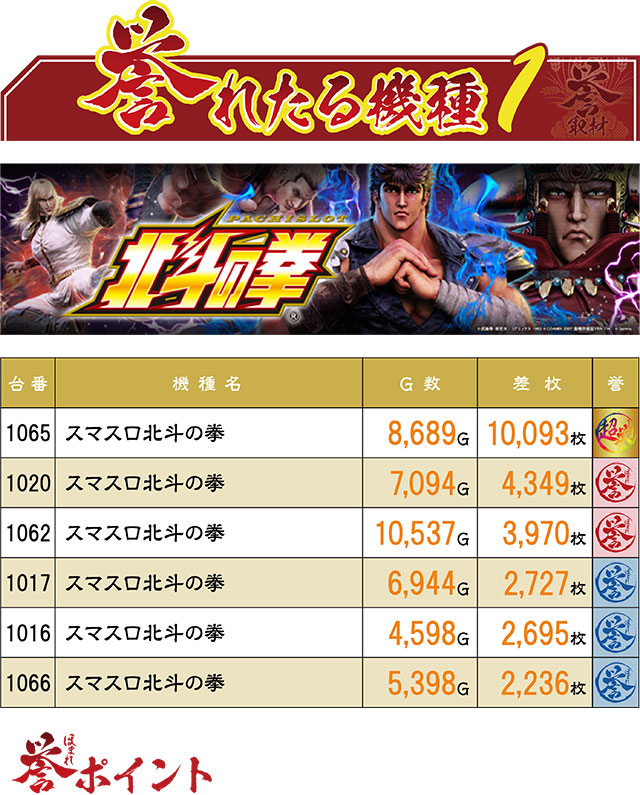 設置の1/3以上の台が誉マークだった『スマスロ北斗の拳』。同機にチャンスが多かったのはこの結果からも明白だが、それでも1065番台の10,000枚超えは予想を超える大金星だったことだろう。
