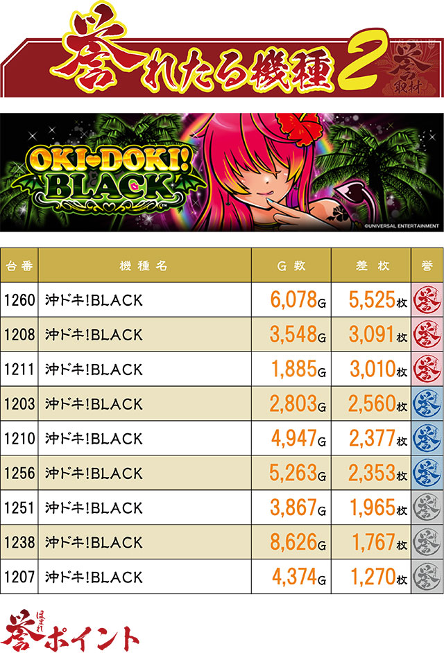 約半数の台に誉マークがついたのは『沖ドキ!BLACK』。人気マシンだけあってシマ内の活気は凄まじく、その活気に比例して大当りも矢継ぎ早に出現。おかげで誉マークが複数生まれることとなった。