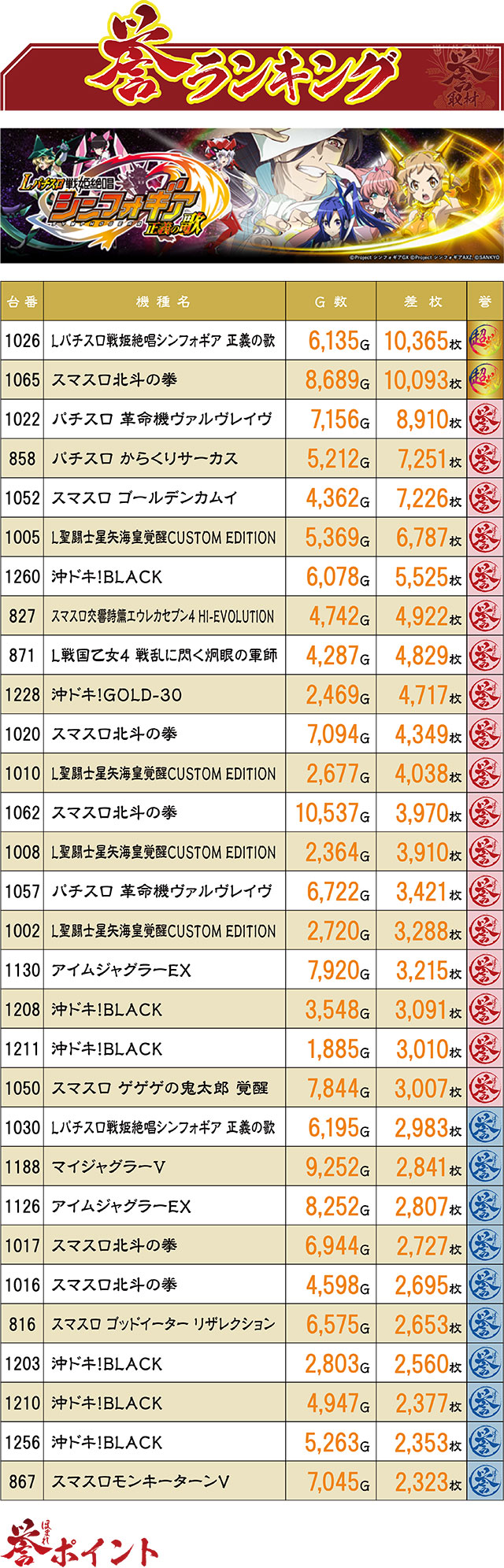 10,000枚超えレコードが2台、文句なしの誉ランキングとなった今回。特に目立った活躍を見せていたのは、TOP30内に5台のランクインを果たした『L聖闘士星矢海皇覚醒CUSTOM EDITION』『スマスロ北斗の拳』、6台のランクインを果たした『沖ドキ!BLACK』!