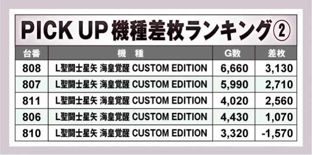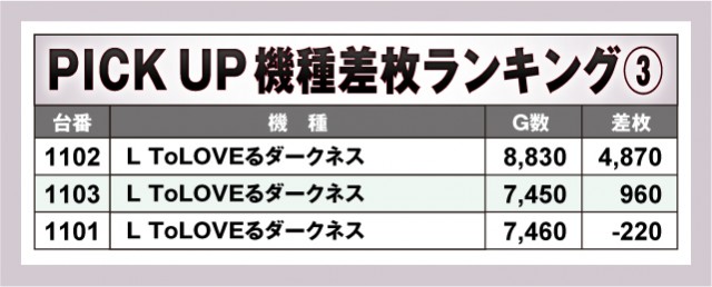 今回のピックアップは『スマスロ ゴッドイーター リザレクション』と『L聖闘士星矢 海皇覚醒 CUSTOM EDITION』と『L ToLOVEるダークネス』の3機種となっている。どの台がどれくらいの差枚数となっているのかチェックしておこう。