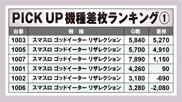 新機種で言えば『パチスロ かぐや様は告らせたい』においても1106番台から6,370枚! 『スマスロ ゴッドイーター リザレクション』からも1003番台、1005番台が5000枚前後の差枚となるなど新機種が上位を占める形となった。