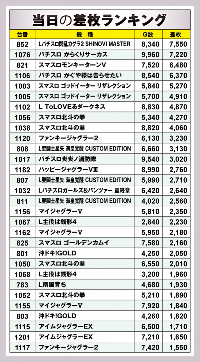 さて、今回の優秀台はコチラ。差枚数トップは新機種の『Lパチスロ閃乱カグラ2 SHINOVI MASTER』。852番台から7,550枚が飛び出している。