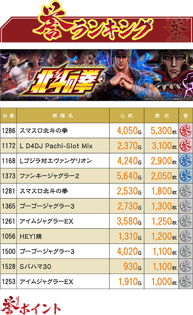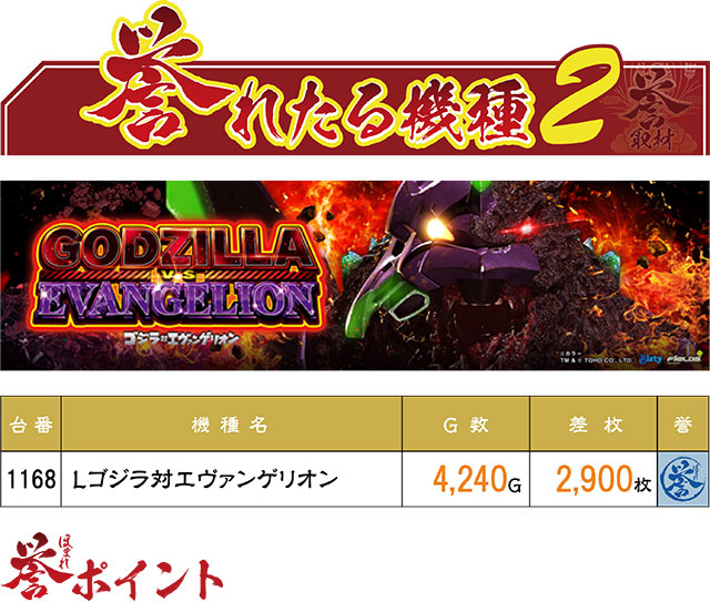 2台設置の『Lゴジラ対エヴァンゲリオン』は、1台が青誉マーク、もう1台はマイナス350枚という結果に。しかしマイナス台の方は1,000Gちょいしか回されておらず、しっかり回されていたら2台ともが誉マークだった可能性も。