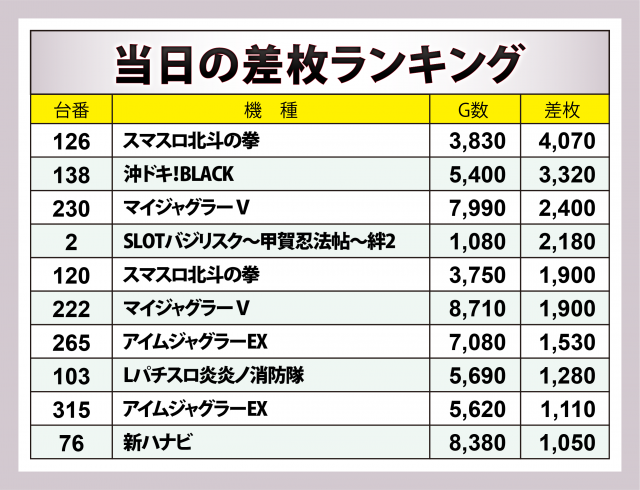 最初はこの日の上位10台をチェック。10台全てが+1,000枚以上を達成、+2,000枚以上は4台、+3,000枚オーバーは2台、+4,000枚オーバーは1台となった。