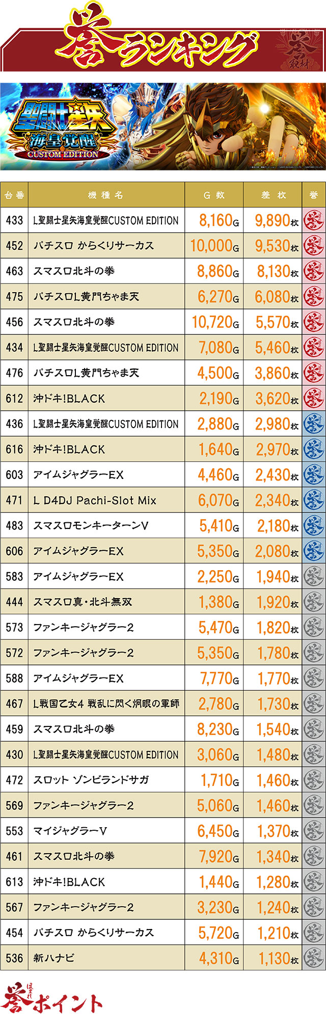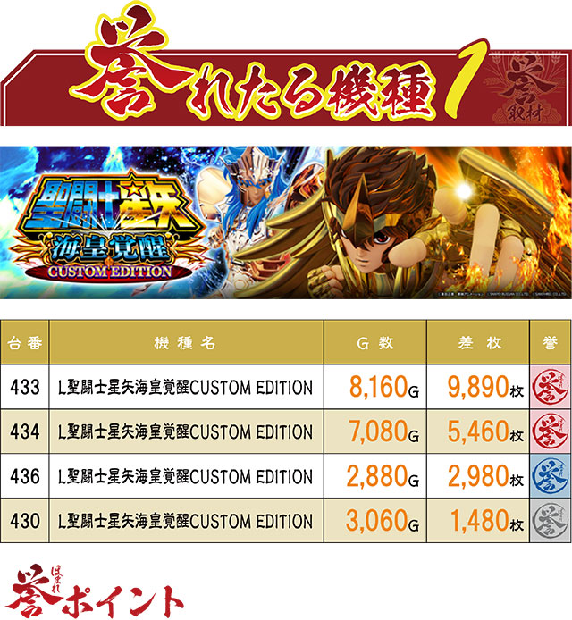 前回8/10も活躍を見せた『L聖闘士星矢海皇覚醒CUSTOM EDITION』は、今回も大暴れ!4台が誉マークとなったばかりか、433番台が10,000枚に迫る記録で、この日の最高差枚を叩き出した。