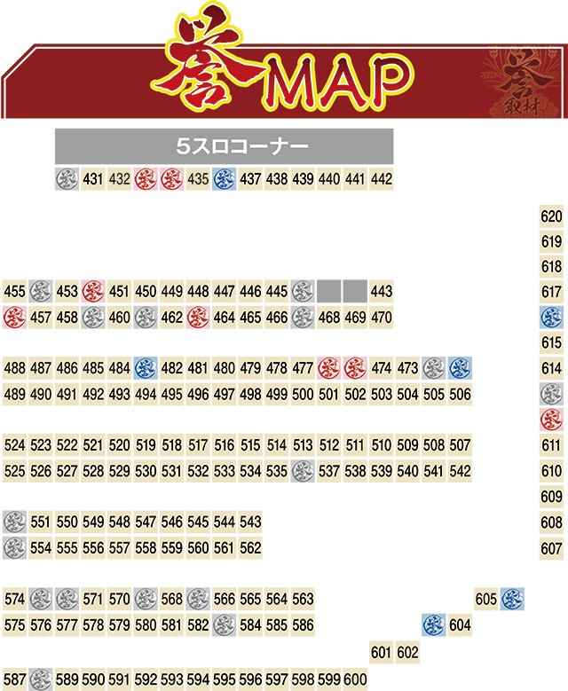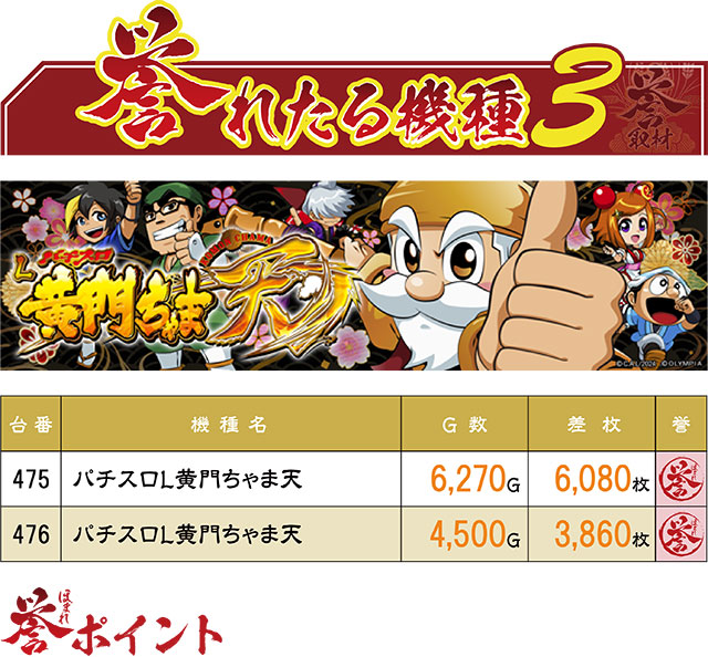 前回、最高差枚記録に輝いた『L聖闘士星矢海皇覚醒CUSTOM EDITION』が、今回も9,890枚という見事な記録で首位の座についた。さらに2位の『パチスロ からくりサーカス』も前回2位となっており、この2機種が注力されていたのは明白。また直近で2台導入されたばかりの『パチスロL黄門ちゃま天』は、2台ともが赤誉マーキング!