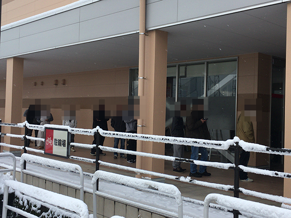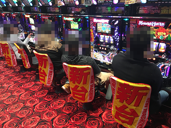 開店前には、40名前後のプレイヤーが集合。なかには、談笑しているといった姿もみられ、ホールに大きな期待を寄せているようであった。