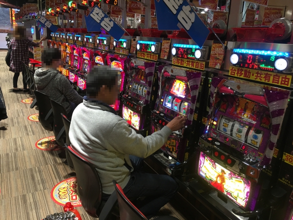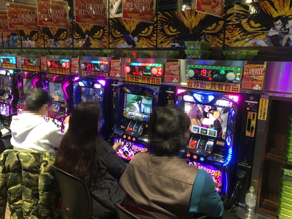 20円パチスロで人気を集めていたのは「バジリスク~甲賀忍法帖~絆」。プレイヤーの笑顔からは、満足感を得ていることが伝わってきた。