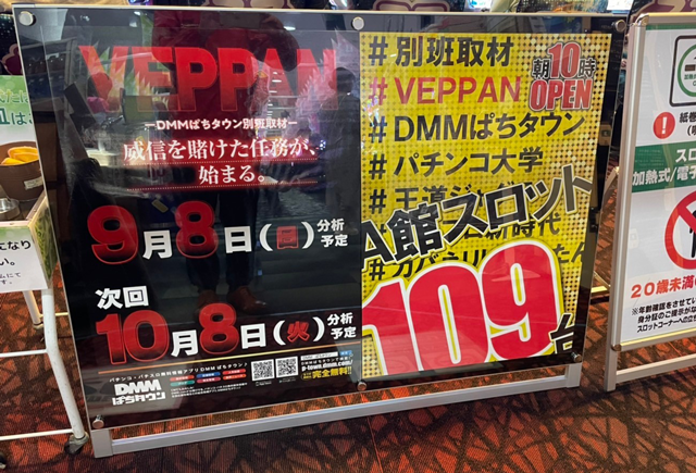 DMMぱちタウン取材班〝別班〟が威信を賭けて執り行う「VEPPAN」が、9月8日に「パチンコ大学A館」にて実施された。当日は朝イチから43人のファンたちが集まり、取材時もスロットコーナーのアチコチに良台を確認することができた。果たしてどれほどの盛り上がりを見せてくれたのか、ここからはスロット全109台の詳細とともに、当日の店内の盛り上がりをチェックしていこう!