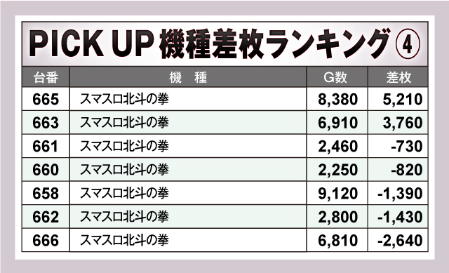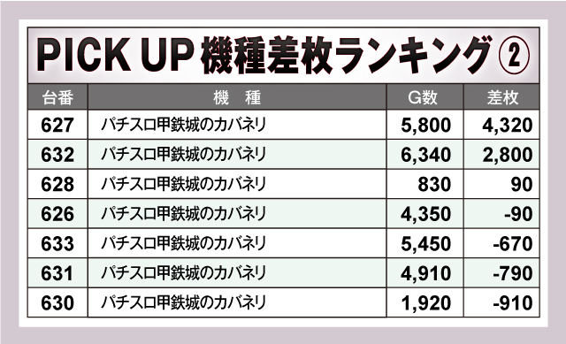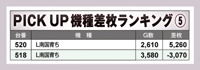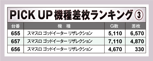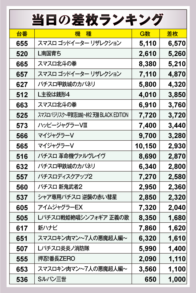 まずは当日の差枚ランキングを紹介していこう。24台のうち17台が差枚+2,000枚オーバーで、それらのなかでもっとも優秀だった台は、655番台の「スマスロ ゴッドイーター リザレクション」で、差枚は+6,570枚を獲得! その他ランクイン機種を見渡すと、「マイジャグラーV」などのノーマルタイプが多数ランクイン。もちろんその他スマスロや6号機・6.5号機のAT/ART機など幅広い機種もランクインしていたので、次回以降はしっかりチェックしておこう!