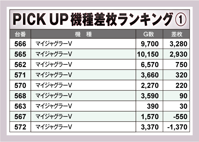 続いては、当日店内を大いに盛り上げた5機種をチェック。まず「マイジャグラーV」は、ピックアップ9台のうち7台がプラスで終了しており、そのうち2台が差枚+2,000枚超えと上々の結果をマーク! その他の機種も素晴らしく、5機種全てがトータルプラス終了していた!