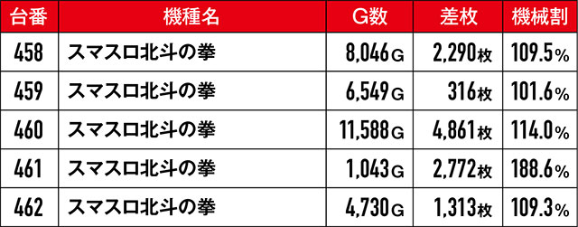5台設置の『スマスロ北斗の拳』は、全台がプラス!しかも5台中3台が2,000枚を上回っており、機種まるごとで盛り上がっていた。わずか1,043Gで2,500枚以上を吐き出し、機械割188%をマークした461番台が、8,000G以上回されていたらどうなっていたのか、非常に気になるところ。