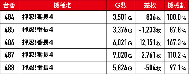 5台中3台がプラっていたばかりか、486番台が12,000枚オーバーを達成した『押忍!番長4』。マイナスの2台も挙動は悪くなかったようで、ヒキ次第では全台プラスも十分狙えた…!?
