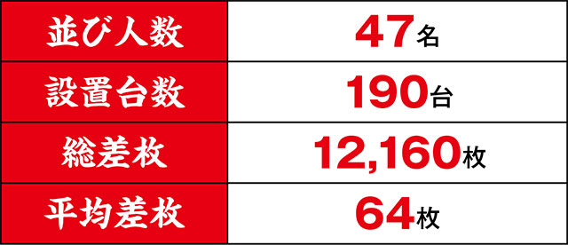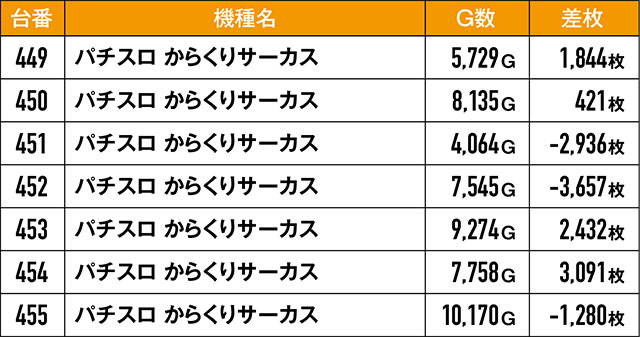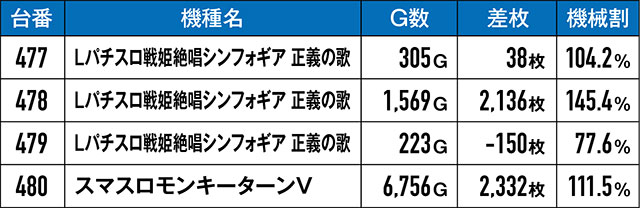こちらの4台は、4台並んで好挙動を示していた。3,000枚を上回る結果は生まれなかったものの、安定して当たりを供給する様を見るに、優秀台の可能性は十分!