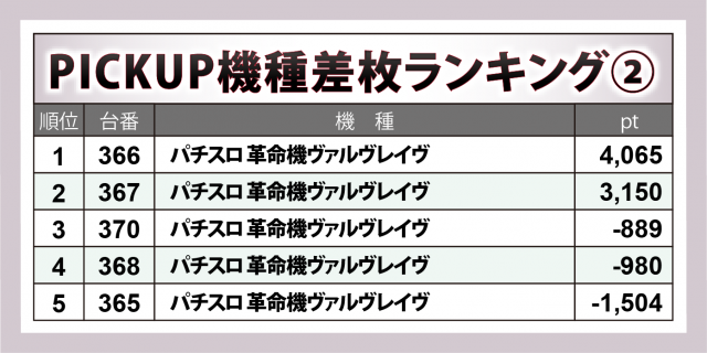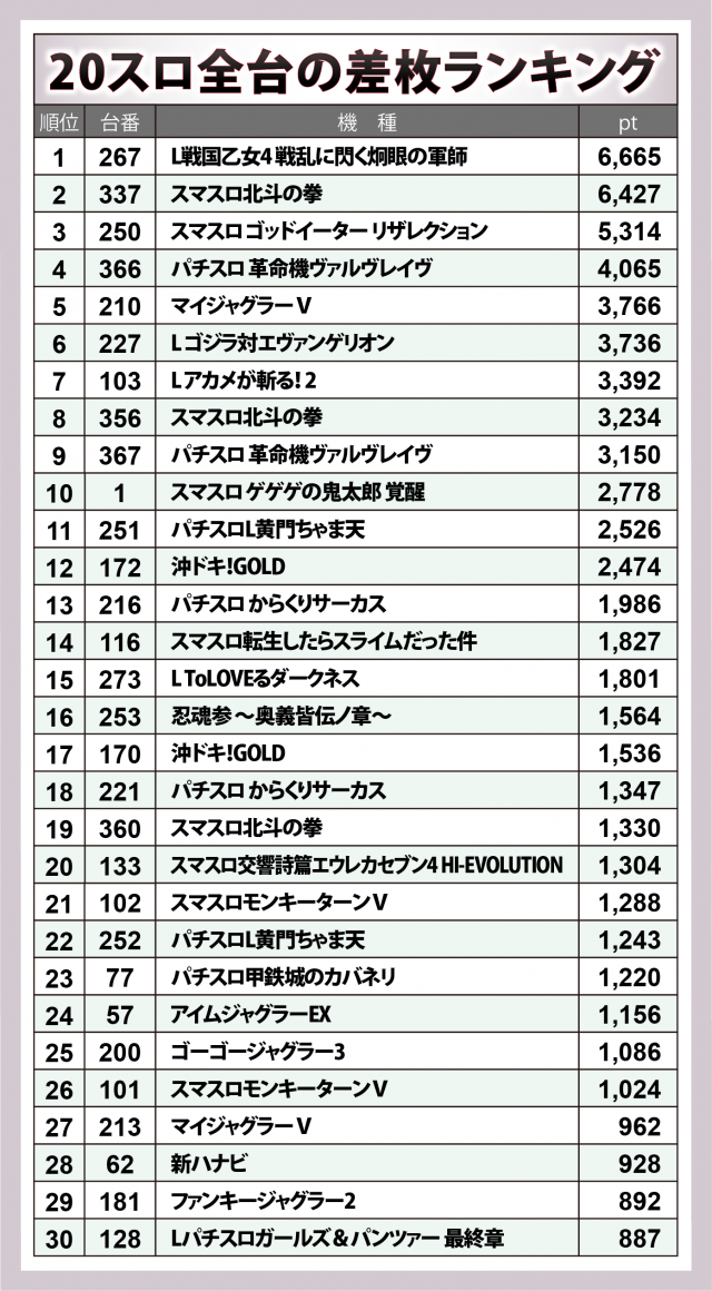 30台のうち26台が4桁プラスを成し遂げ、+2,000枚以上は12台、+3,000枚以上は9台、+4,000枚オーバーは4台、+5,000枚オーバーは3台、+6,000枚オーバーは2台となった。