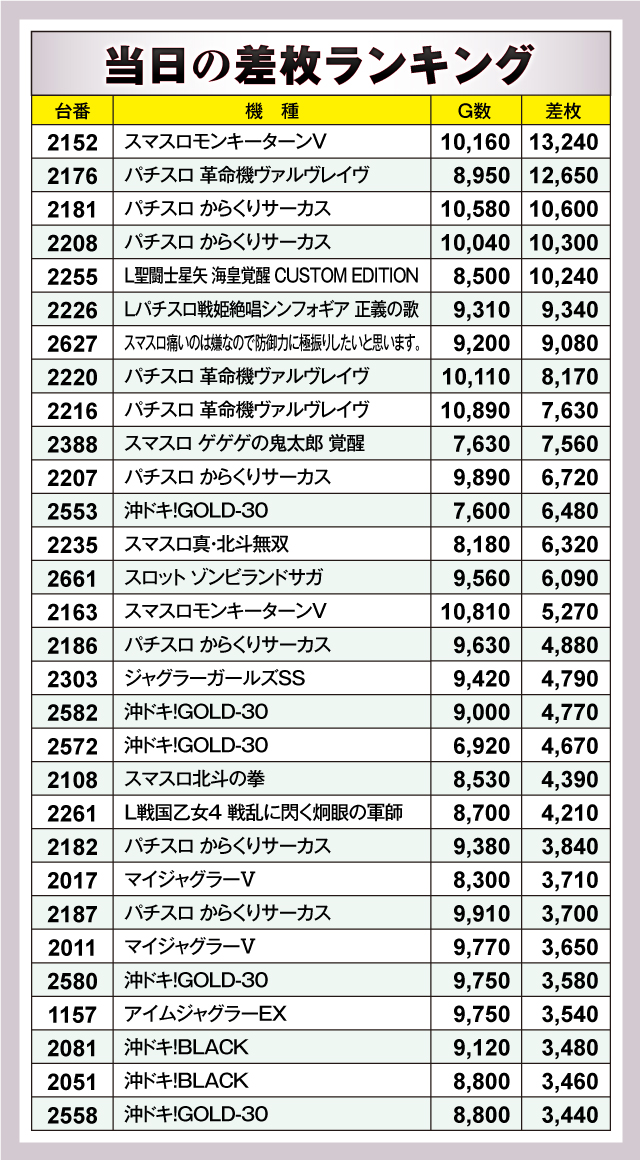 『スマスロモンキーターンV』『パチスロ 革命機ヴァルヴレイヴ』『パチスロ からくりサーカス』『L聖闘士星矢 海皇覚醒 CUSTOM EDITION』から合計5台の万枚OVERが発生。ホール内で注目の的となっていた。このほかにも5,000枚OVERの大台突破台が多数生まれており、各コーナーで打ちごたえのある展開に歓喜したファンも多かった。