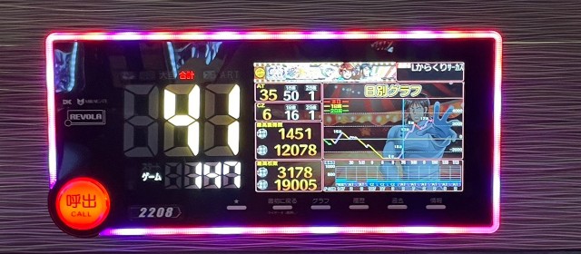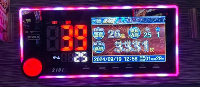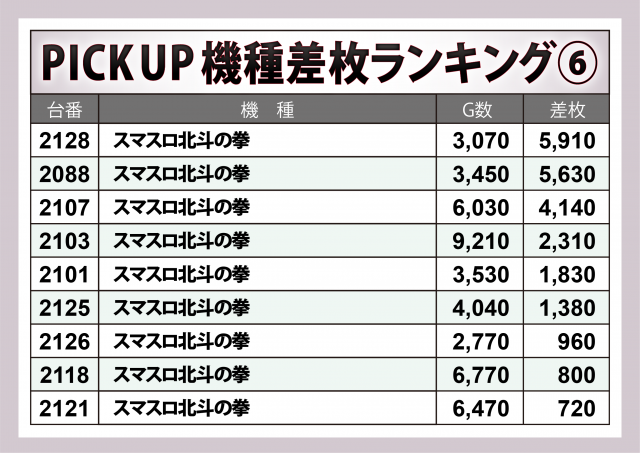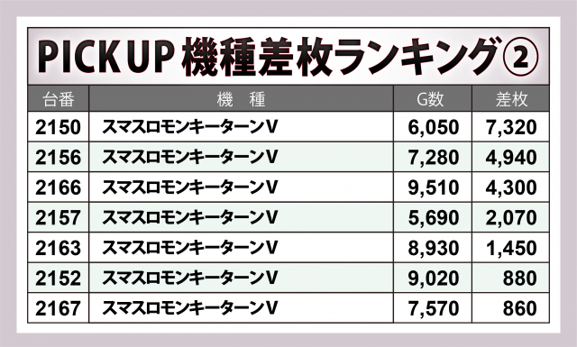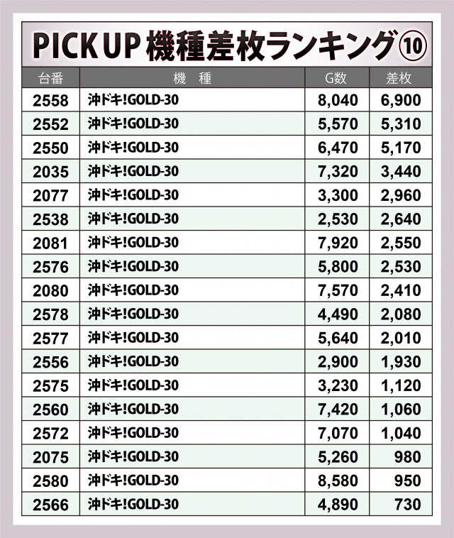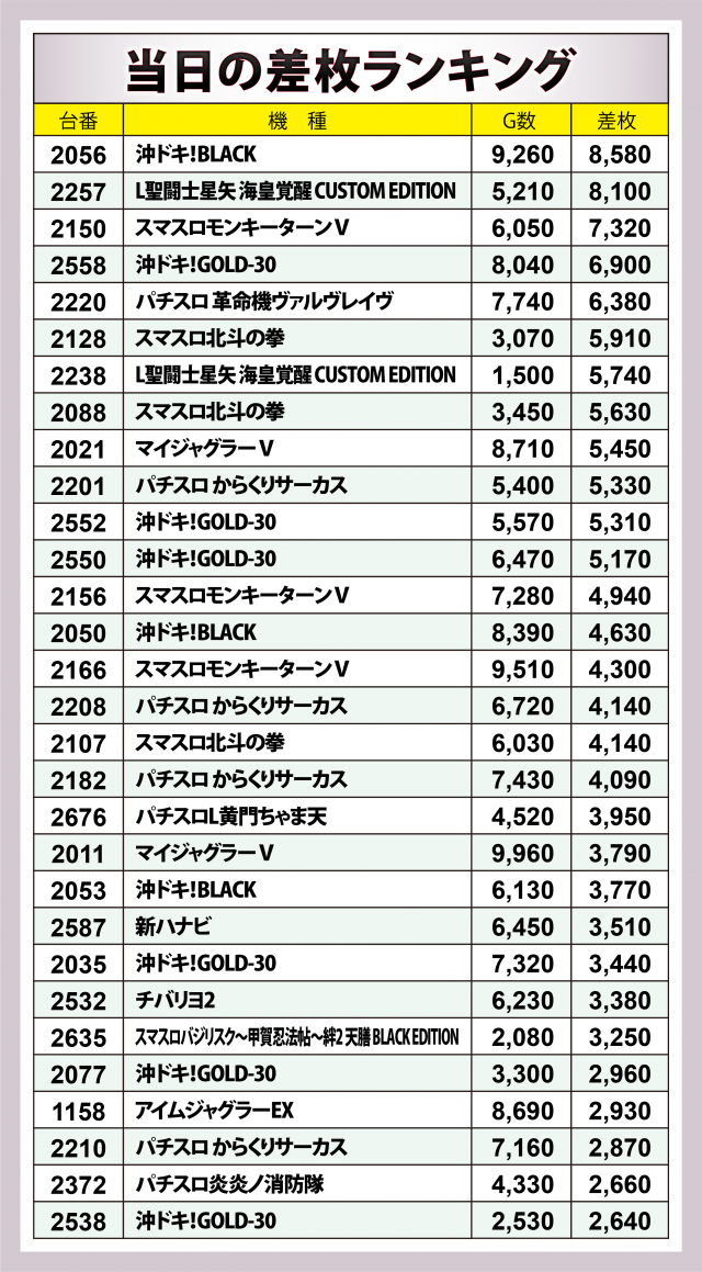 まず上位30台の数字をチェック。同店ではよく見られる光景だが30台の全てが+2,000枚以上となり、+3,000枚以上は全体の8割強を占める25台、+4,000枚オーバーは18台、+5,000枚オーバーは12台、+6,000枚オーバーは5台、+7,000枚オーバーは3台、+8,000枚オーバーは2台となった。