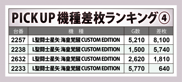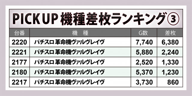 また『L聖闘士星矢 海皇覚醒 CUSTOM EDITION』では+8,100枚超・+5,700枚超が1台ずつ、『スマスロモンキーターンⅤ』では+7,300枚超×1・+4,000枚超×2、『パチスロ 革命機ヴァルヴレイヴ』では+6,400枚弱、『スマスロ北斗の拳』では+5,000枚超×2・+4,100枚超×1、『パチスロ からくりサーカス』では+5,300枚超×1・+4,000枚超×2と、人気のスマスロ陣もポテンシャルを十分に活かした。