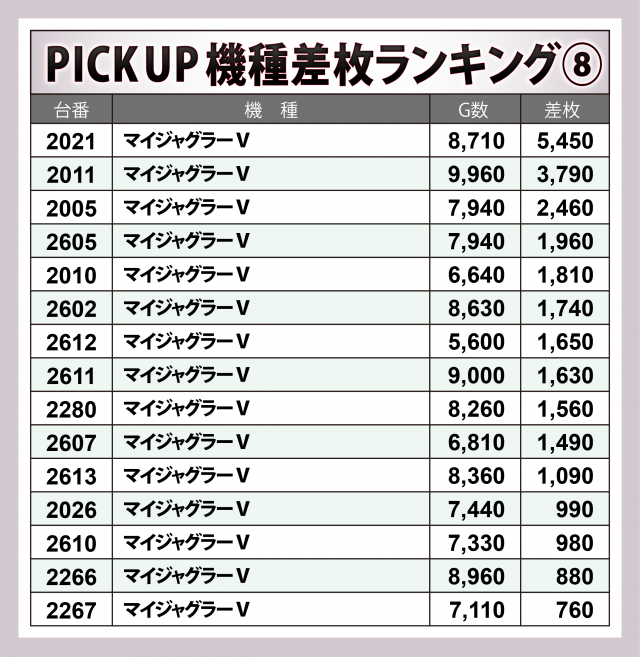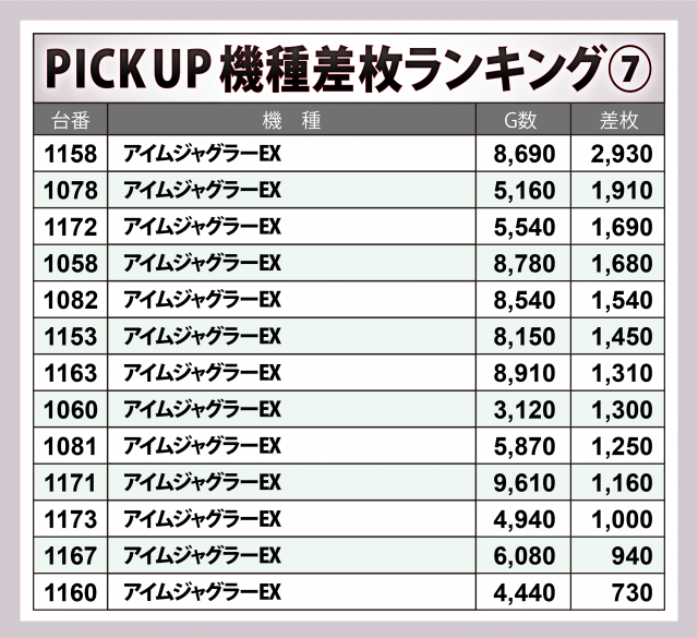 さらに+5,500枚弱とボーナスタイプとは思えない台が輩出された『マイジャグラーⅤ』に加え『アイムジャグラーEX』といったジャグラーシリーズにも優秀台が続出した。