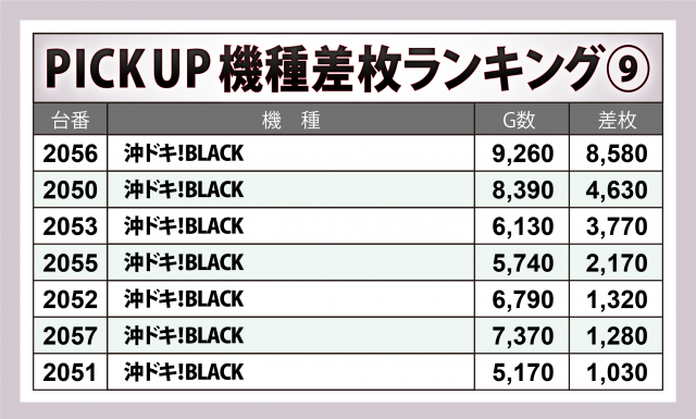 『沖ドキGOLD』を差枚数で上回ったのが『沖ドキ!BLACK』で、2056番台が+8,600枚弱となった他、+4,600枚超・+3,800枚弱が1台ずつ追随した。