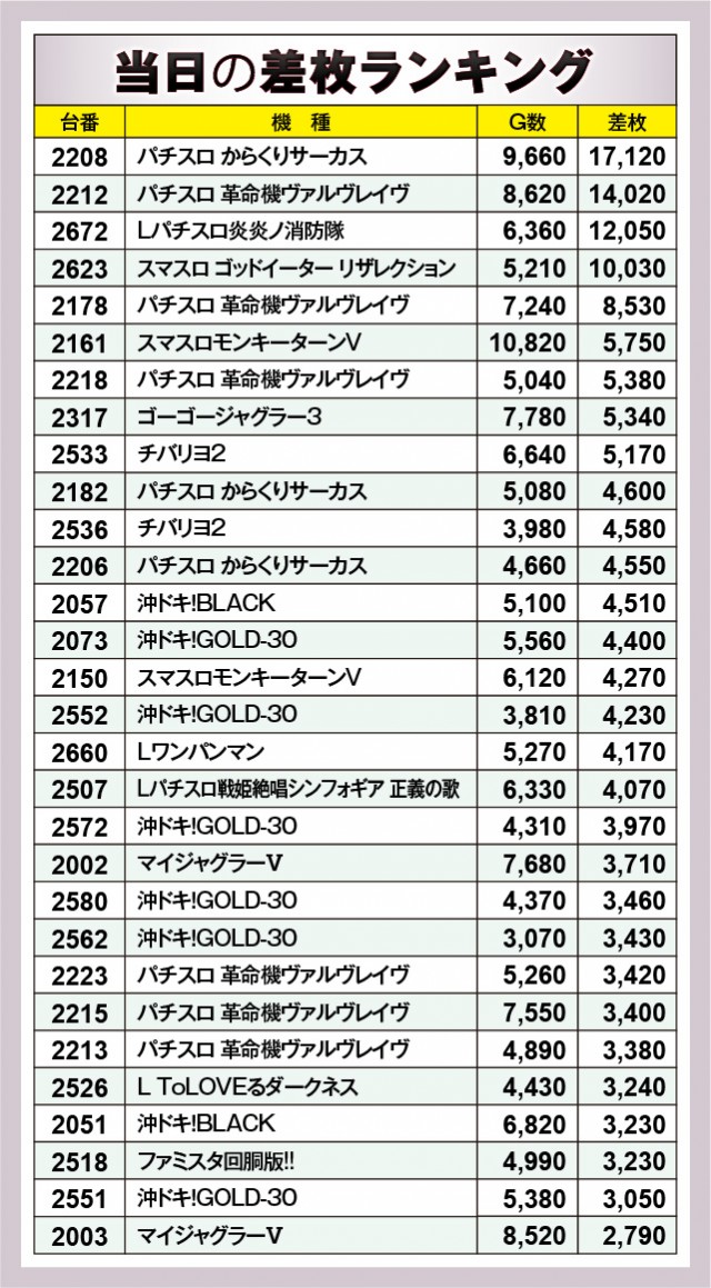 『パチスロ 革命機ヴァルヴレイヴ』『Lパチスロ炎炎ノ消防隊』『スマスロ ゴッドイーター リザレクション』から万枚OVERが発生しており、『パチスロ からくりサーカス』に至っては17,120枚という凄まじい熱量を披露。人気AT機の活躍が見て取れるが、一方で『チバリヨ2』『沖ドキ!BLACK』『沖ドキ!GOLD-30』といった沖スロ機も盛り上がっていた。いずれも活気が閉店まで絶えず、大きく盛り上がった1日になったのは確かだ。