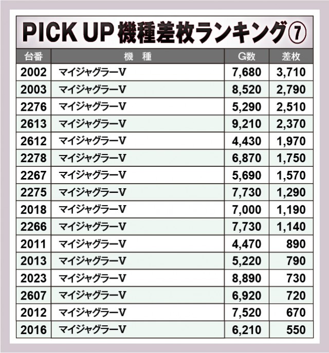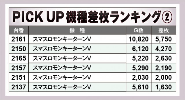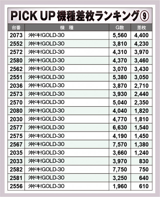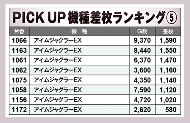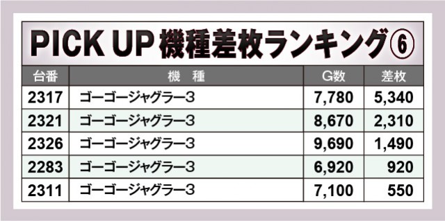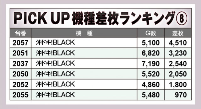 上表でピックアップされた機種は、いずれも高い活気と熱気に満ちたエリアだったと言える。前述した万枚台の存在もそうだが、やはり『沖ドキ!BLACK』『沖ドキ!GOLD-30』の活躍は一目置くべきだろう。大量設置された看板機種が多くのプラス台を生んでいる事実から、同店が相当な力を入れているのは間違いない。また『ジャグラー』シリーズも奮闘しており、あらゆる機種が活躍していたのが見て取れる。
